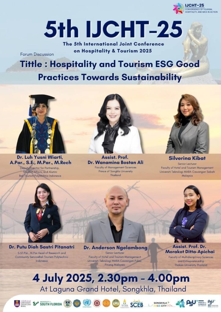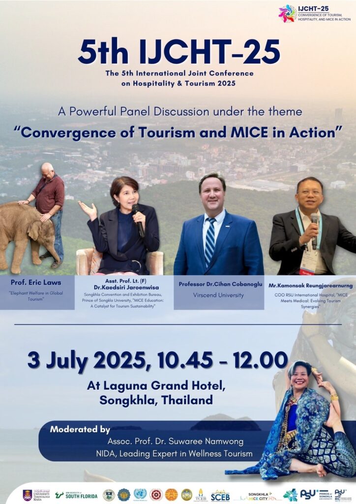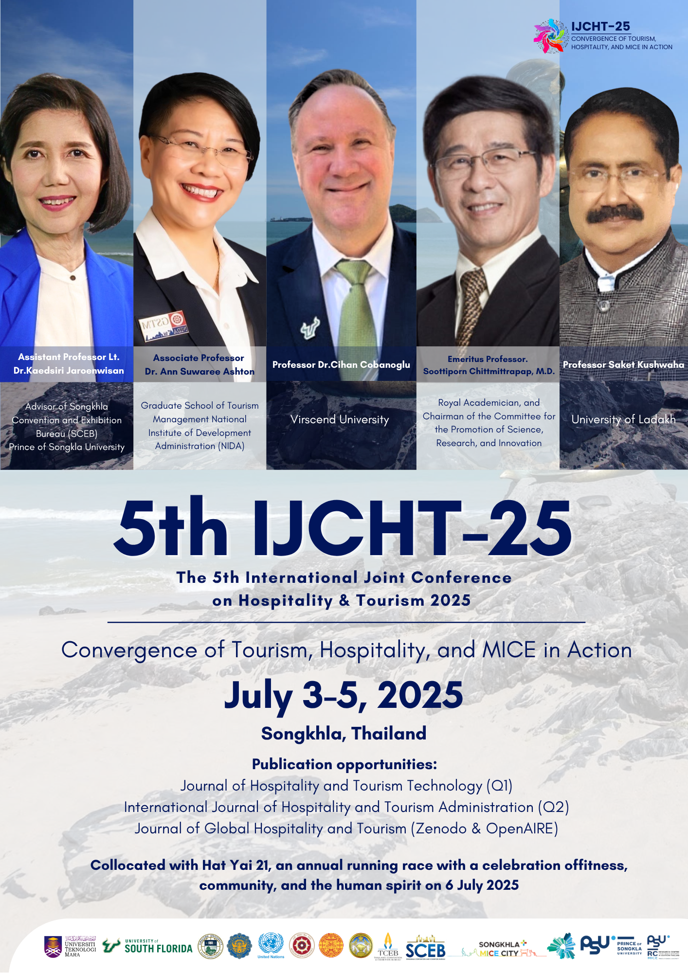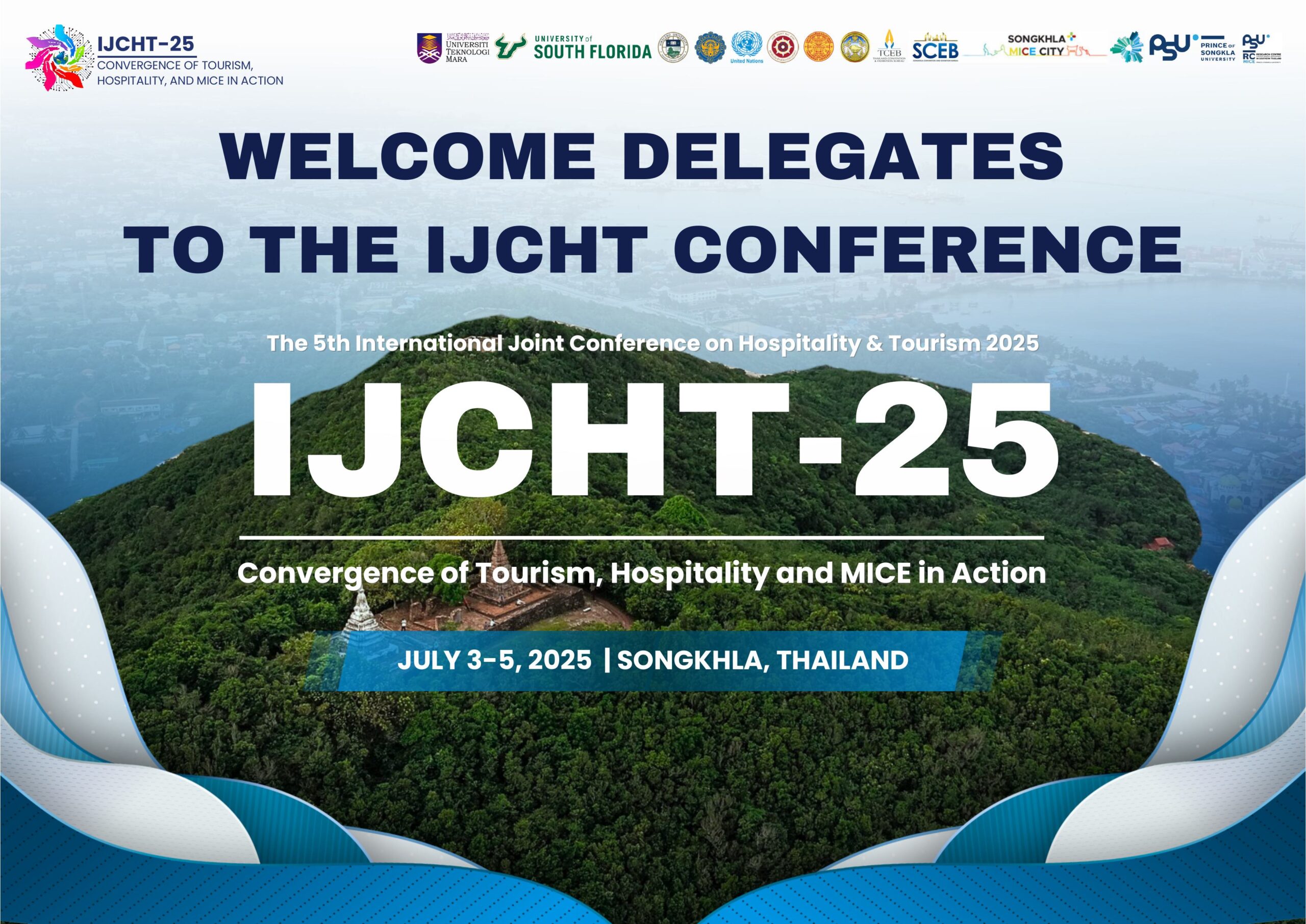It is my great pleasure to welcome you all to the 5th International Joint Conference on Hospitality & Tourism (IJCHT 2025) here in Songkhla, a city that may not be as widely recognized as Bangkok, Chiang Mai, Krabi, or Phuket, but holds a unique charm and remarkable potential. While the spotlight often shines on the major cities, the true allure of Thailand lies in its smaller towns, and Songkhla is a testament to this hidden gem.